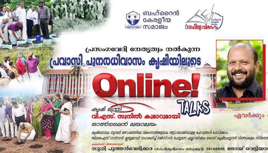 ബഹ്റൈൻ കേരളീയ സമാജം സാഹിത്യവിഭാഗം പ്രസംഗവേദി യുടെ നേതൃത്വത്തിൽ പ്രവാസി പുനരധിവാസം കൃഷിയിലൂടെ എന്ന വിഷയത്തെ മുൻനിർത്തിയും തൃശൂർ മണ്ഡലത്തിലെ വികസന പദ്ധതിയെ പറ്റി തൃശൂർ നിവാസികൾക്കും മന്ത്രിയുമായി ഓൺലൈൻ അഭിമുഖം സംഘടിപ്പിച്ചിരിക്കുന്നു. സമാജം മെമ്പർ അല്ലാത്തവർക്കും മറ്റു അസോസിയേഷൻ മെമ്പേഴ്സിനും പങ്കെടുക്കാം. ഓഗസ്റ്റ് 19 വെള്ളിയാഴ്ച വൈകിട്ടു 4 മണിക്കാണ് പ്രോഗ്രാം. സമാജം ഡയമണ്ട് ജൂബിലീ ഹാളില് നടത്തുന്ന പരിപാടിയില് ഒന്നര മണിക്കൂര് മന്ത്രിയുമായി ചോദ്യോത്തരങ്ങളിലൂടെ സംവദിക്കാനുള്ള അവസരം ലഭിക്കുന്നു .