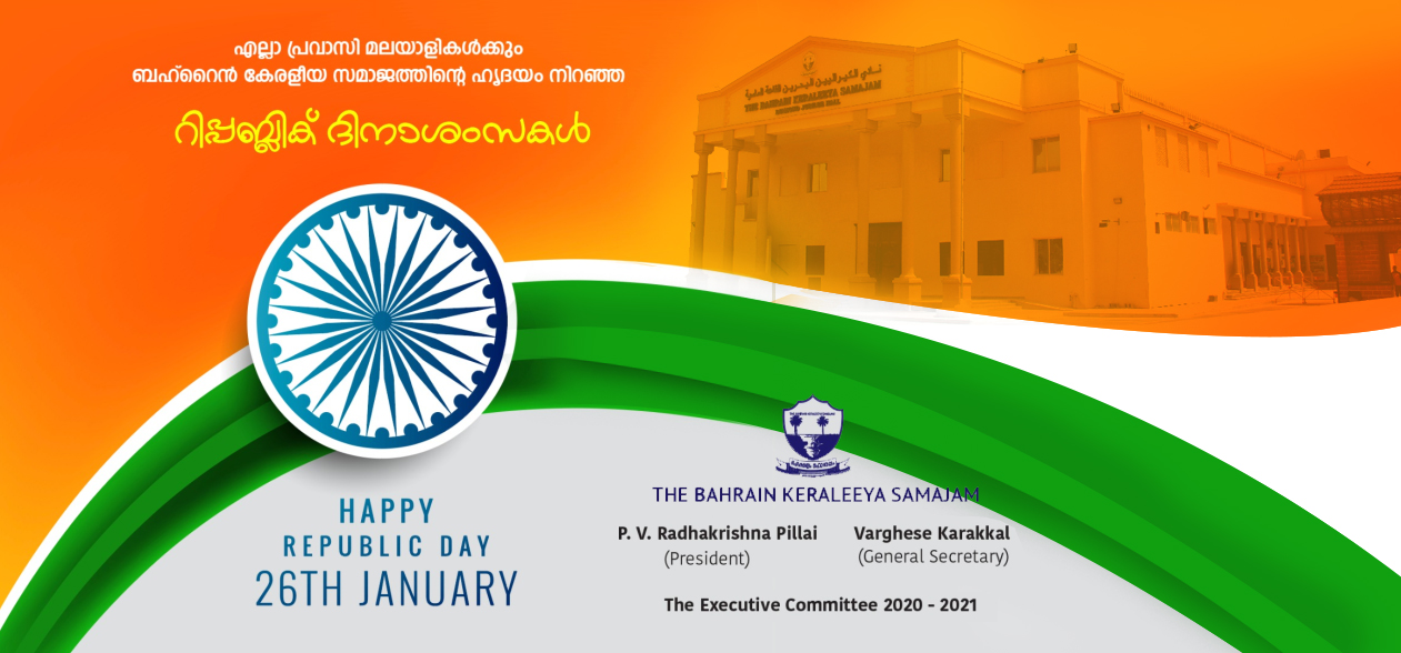 On the occasion of the 71st Republic Day of India, the Bahrain Keraleeya Samajam will be organizing a Flag hoisting ceremony on Sunday, the 26th January 2020, at 07.00 am at Samajam premises. All are welcome.