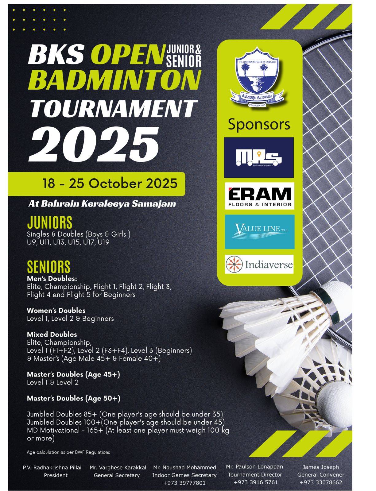 Bahrain, October 2025 – Bahrain Keraleeya Samajam (BKS) is proud to announce the Second BKS Open Junior & Senior Badminton Tournament, scheduled to take place from 18th to 26th October 2025 at the BKS Indoor Stadium.