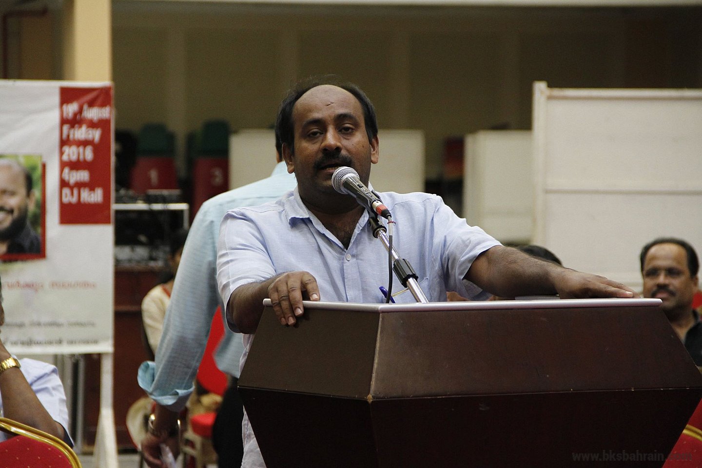 ബഹ്റൈൻ കേരളീയ സമാജം സെക്രട്ടറി വീരമണി സ്വാഗതം പറഞ്ഞ യോഗത്തിൽ പ്രസിഡന്റ് പി വി രാധാകൃഷ്പിള്ള അധ്യക്ഷപ്രസംഗം നടത്തി. തൃടർന്നു സാഹിത്യ വിഭാഗം സെക്രട്ടറി സുധി പുത്തൻ വേലിക്കര, കൺവീനർ അഡ്വക്കറ്റ് ജോയ് വെട്ടിയാടാൻ, അജിത് തുടങ്ങിയവർ സംസാരിച്ചു.